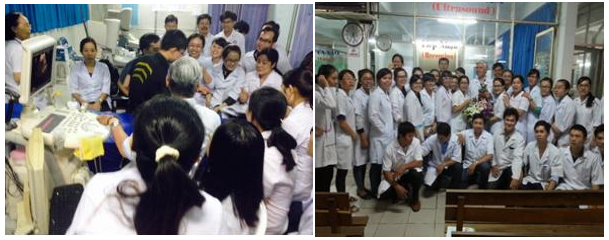 Các bác sĩ học viên từ mọi miền Đất Nước tham dự các buổi siêu âm bụng căn bản tại TT.Medic. (Người đứng thứ tư tính từ bên phải là BS Lê trọng Đại công tác tại Hà Nội)