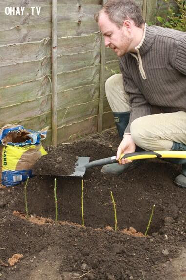 4) Đặt những khoai tây có ghim nhánh hoa hồng vào luống đã chuẩn bị, khoảng cách giữa chúng khoảng 15 cm.