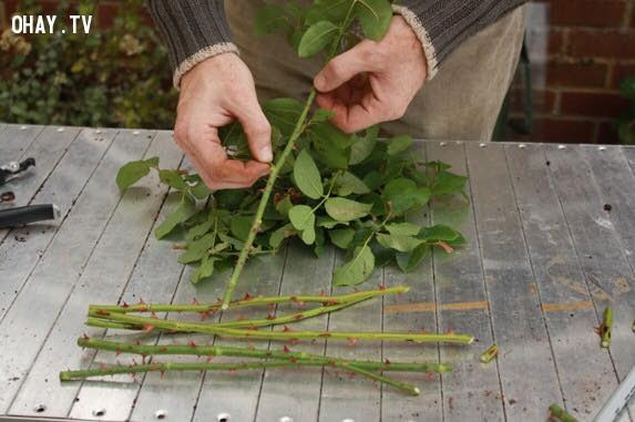2) Kế đến, bạn hãy cắt vài nhánh hoa hồng từ bó hoa mua ở cửa hàng hay hoa hồng trong vườn nhà. Bạn tước bỏ hết lá trên những nhánh vừa mới cắt.
