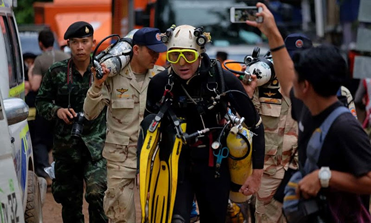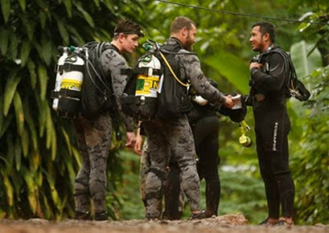 Trong 24 giờ sau khi được tin các trẻ em mất tích, đơn vị Người Nhái (Navy SEAL) thuộc quân đội Thái Lan đã có mặt, nhưng họ lúng túng vì chỉ quen “hành quân” trong sông hồ, biển vùng nước ấm. Họ chưa bao giờ, với những dụng cụ cồng kềnh, chui vào các đường hang ngập nước, nhiều nơi chật hẹp nước tuôn như thác đổ, và chung quanh tối mù, đưa bàn tay ra phía trước cũng không thấy. Bình thường, các người nhái nếu gặp khó khăn có thể quyết định ngoi lên trên mặt nước để điều chỉnh, nhưng trong các đường ngầm ngoắt ngoéo chung quanh toàn đá sắc cạnh, họ không thể làm như vậy được.