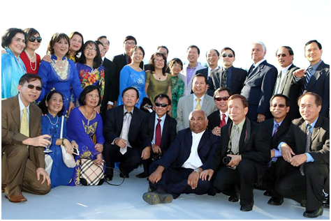 Hai Thầy Đào Hữu Anh (người thứ 3 tính từ bên phải, tóc bạc, mặc áo sơ-mi trắng sọc) và Vũ Qúi Đài (người thứ 3 tính từ bên trái, tóc nhuộm đen, mặc áo sơ-mi đỏ) chủ tọa buổi họp mặt trên du thuyền.